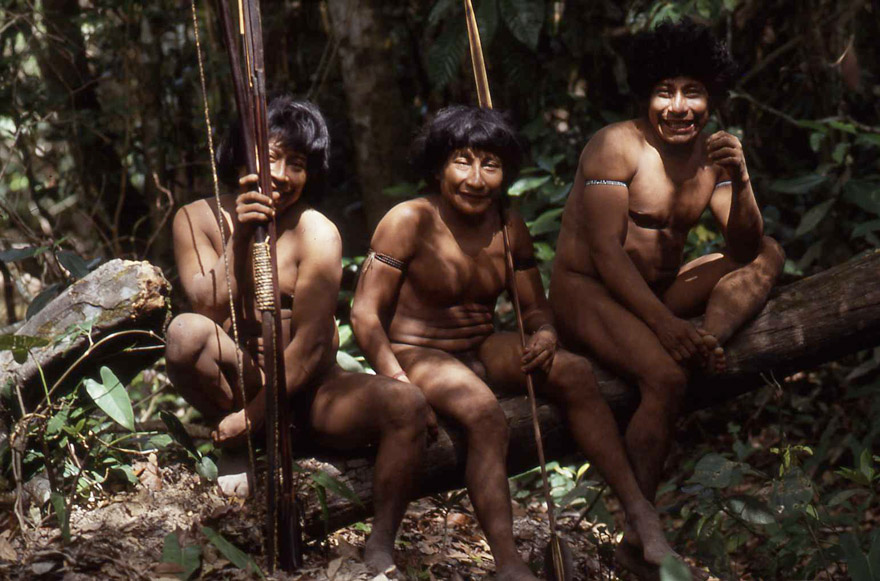 Les Awa Guaja sont des nomades dont l’ère de transhumance se situe à l’orée de la forêt amazonienne, à l’ouest de l’Etat de Maragnan, dans la Sierra de Tiracambu. Les femmes cueillent bananes et baies sauvages, tandis que les hommes chassent et pêchent. Vie harmonieuse donc, jusqu’à ce que n’arrivent géologues, techniciens et autres spécialistes pour construire la ligne de chemin de fer destinée à relier la capitale Sào-Louis au complexe minier de Carajas. A leur traîne, les chercheurs d’or, les faiseurs d’affaires et les fermiers ont occupé leur territoire. Une véritable chasse à l’homme s’est depuis mise en place… Ils vivent encore nus, armés d’arcs et de flèches, se déplaçant sans cesse.